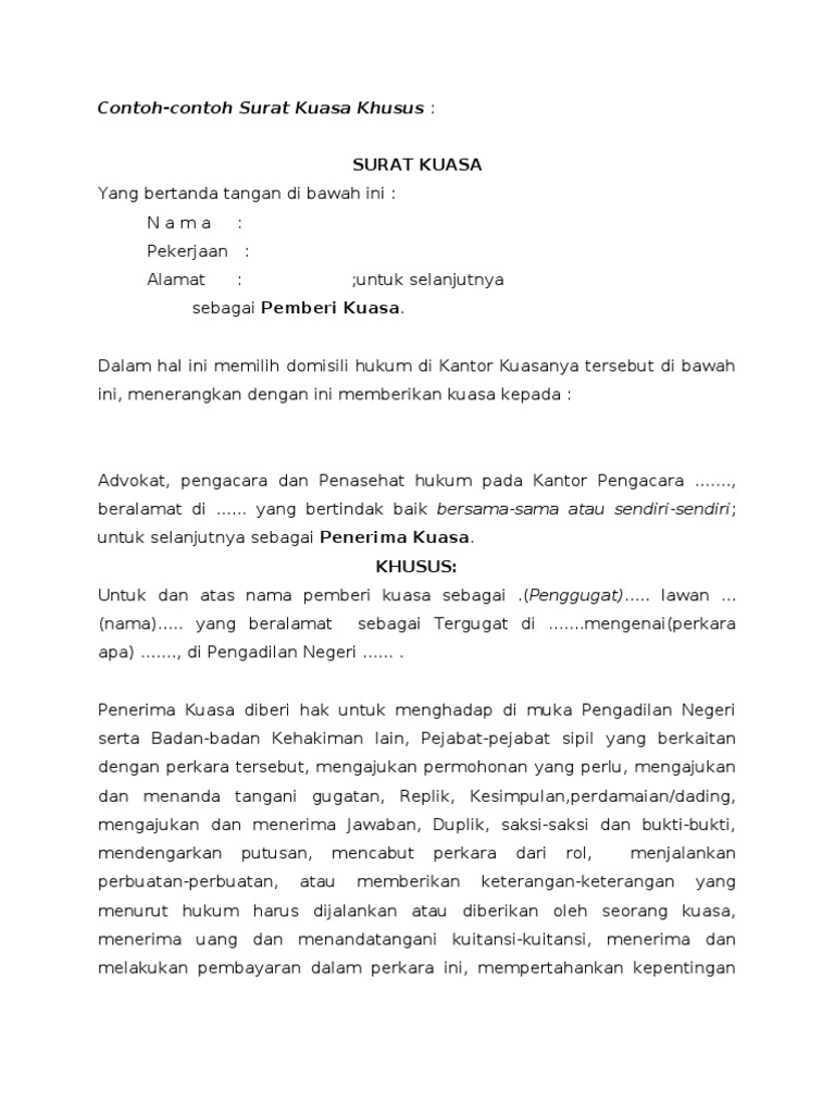 Contoh surat kuasa khusus perdata yang baik sebagai referensi dalam membuat surat kuasa yang resmi dan profesional. Surat kuasa khusus adalah surat kuasa yang dibuat oleh seseorang atau perusahaan kepada pihak advokat (pengacara) untuk tepatnya terdapat dalam kuh perdata pasal 157 hir (pasal 187 rbg). Surat kuasa khusus meliputi kegiatan tertentu yang dialihkan ke penerima kuasa. Contoh surat kuasa pengacara untuk kepengurusan hukum contoh surat kuasa pengambilan uang di bank bni, mandiri, bca, bri Berkenaan dengan pemberian kuasa di atas, penerima kuasa berhak dan berwenang untuk melakukan teguran, menjawab teguran, melakukan pelaporan, mengajukan/ menangani gugatan, menghadiri serta. Hak retensi dan hak subtitusi dalam surat kuasa pertanyaan. Contoh surat kuasa pengambilan ijazah. Contoh surat kuasa khusus perkara perdata perbuatan melawan hukum pmh surat kuasa. Banyak contoh surat kuasa yang ada di internet, tetapi tidak semuanya sesuai dengan pedoman yang benar dan tepat. Pemberian kuasa merupakan perjanjian sebagaimana secara jelas daitur dalam pasal 1792 kuh perdata yang berbunyi. Cek dulu contoh surat kuasa yang baik dan benar]. Untuk mewakili pemberi kuasa sepenuhnya sebagai penggugat dalam perkara perdata perbuatan melawan hukum melawan pt. Apakah diantara kalian sudah ada yang pernak membuat surat kuasa?